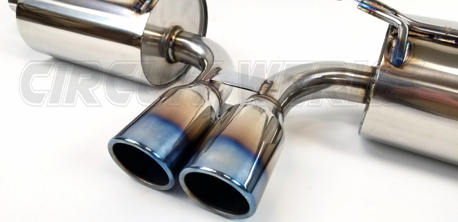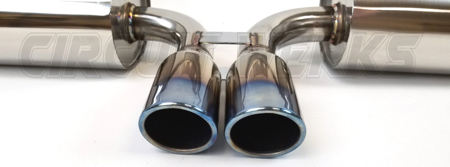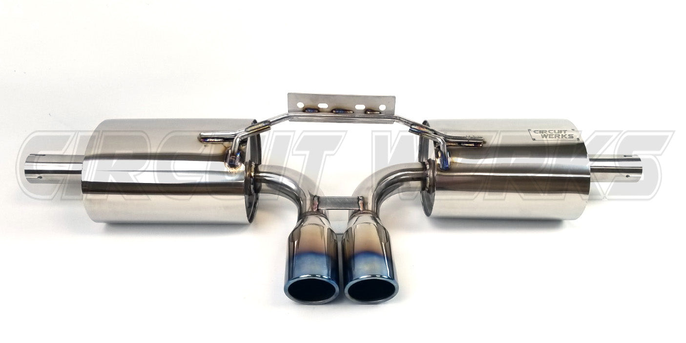 Circuit Werks latest 1997-2004 Porsche Boxster 986 Dual Muffler Exhaust System with Burnt Tips.  Fits all 1997-2004 Base Models and Boxster S Model, which are: 97-99 986 2.5L & 00-04 2.7L and 3.2L.  Twin angle cut 3"/ 76mm rolled tips.  These are the newly updated tips compare to our competitors multi-layer tips.  Fits perfectly between your rear bumper.  The inlets are 1.75"/ 45mm, and clamps directly to your OEM exhaust pipe using your existing OEM hardware.  The Burnt Tips will be exposed from your rear bumper giving it the Titanium look.  Also available in Polished Tips version instead of the Burnt Tips.