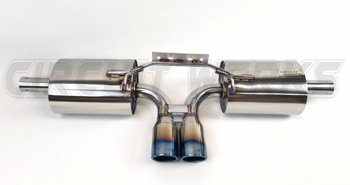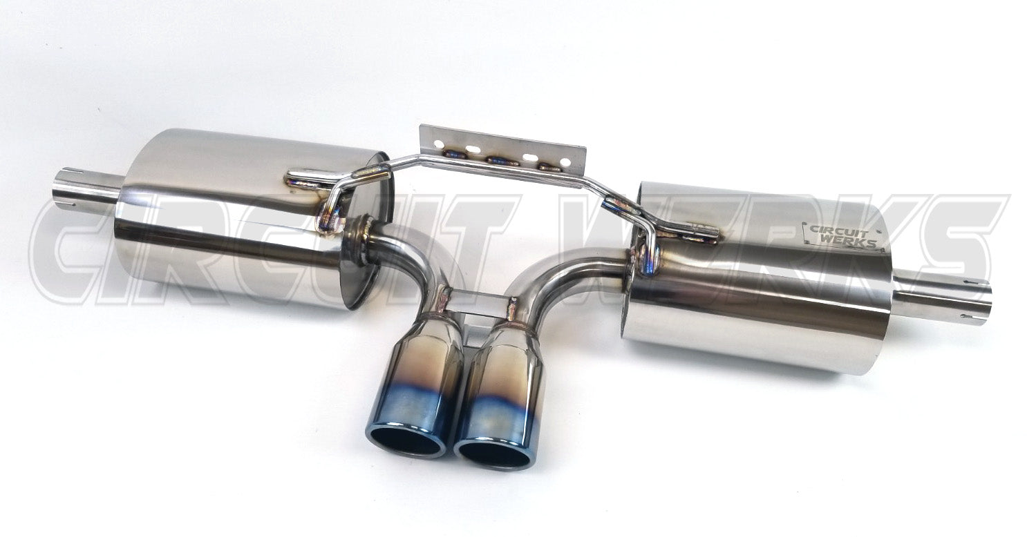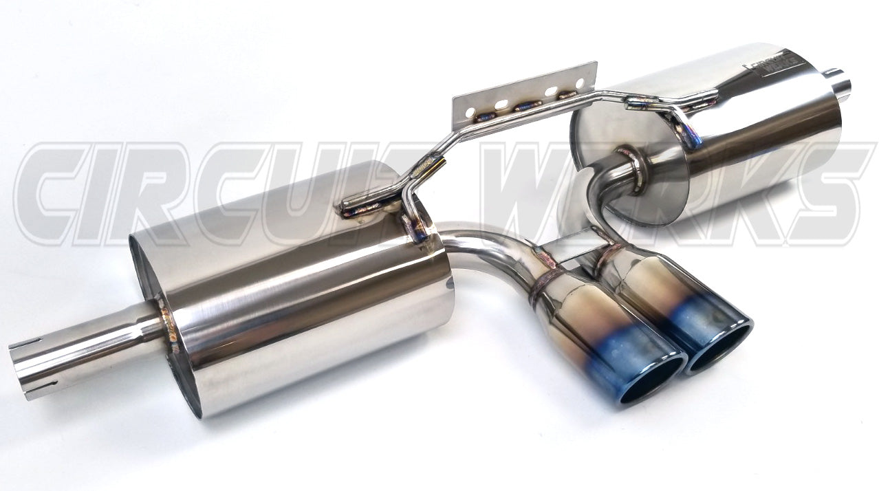 Circuit Werks latest 1997-2004 Porsche Boxster 986 Dual Muffler Exhaust System with Burnt Tips.  Fits all 1997-2004 Base Models and Boxster S Model, which are: 97-99 986 2.5L & 00-04 2.7L and 3.2L.  Twin angle cut 3"/ 76mm rolled tips.  These are the newly updated tips compare to our competitors multi-layer tips.  Fits perfectly between your rear bumper.  The inlets are 1.75"/ 45mm, and clamps directly to your OEM exhaust pipe using your existing OEM hardware.  The Burnt Tips will be exposed from your rear bumper giving it the Titanium look.  Also available in Polished Tips version instead of the Burnt Tips.